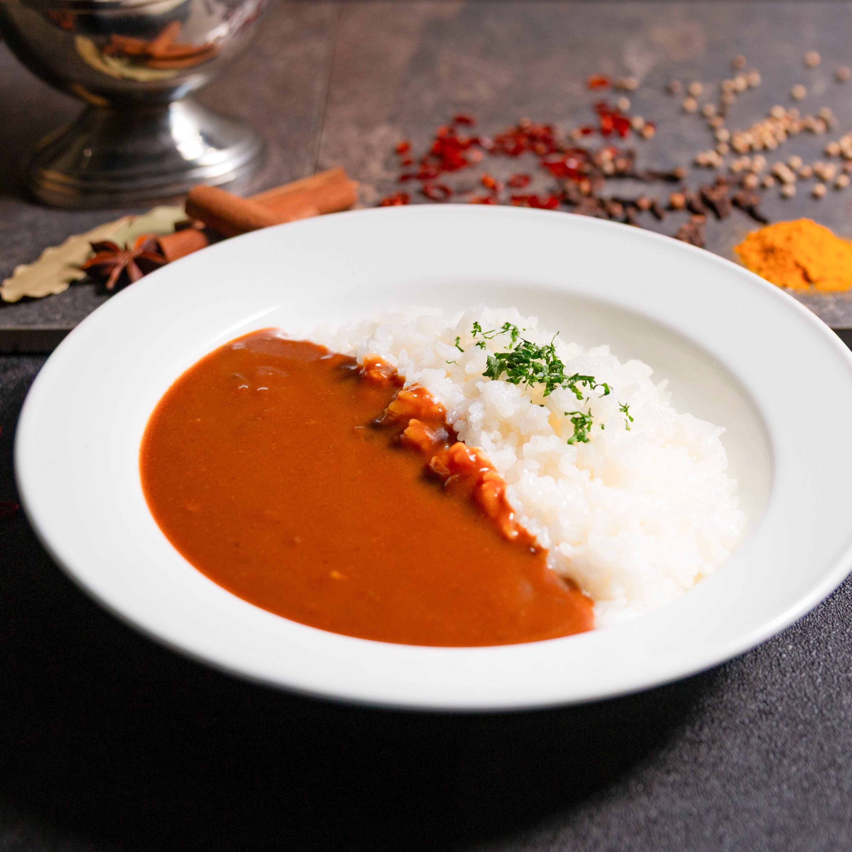 マッシュルームとブイヨン、バターが生み出す、濃厚かつ奥行きのある味わいの欧風カレーです。スパイスが醸し出す豊かな香りと、しっとり柔らかな牛肉をお楽しみください。