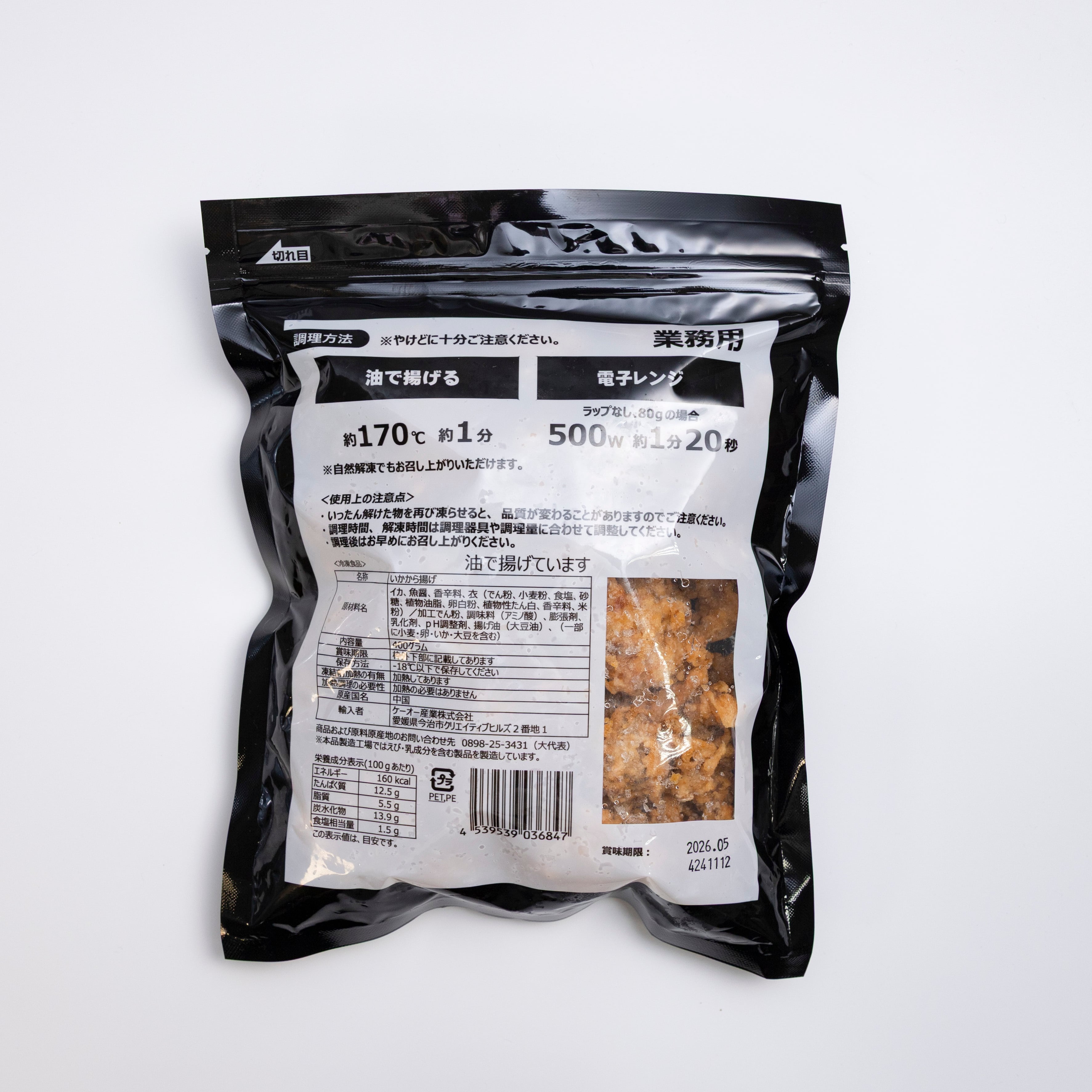 原材料:いか、魚肉、香辛料、衣(でん粉、小麦粉、食塩、砂糖、植物油脂、卵白粉、植物性たん白、香辛料、米粉) /加工でん粉、調味料(アミノ酸)、膨張剤、乳化剤、pH調整剤、揚げ油(大豆油)、(一部に小麦・卵・いか・大豆を含む)